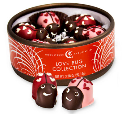 Moonstruck Chocolate out of Portland makes this oh so sweet Love Bug truffle collection, 3 decadent raspberry truffles and 3 succulent strawberry truffles shaped like cute little bugs. Take a look around the Moonstruck site and check out all the other cute truffles they make. On top of being cute, they are amazingly good. I'm partial to their wild huckleberry truffle, it tastes like heaven.